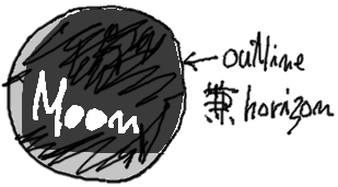 わかる人には常識以前なのだろうが、月を縁取る円周すなわち輪郭線は、じつは地平線でもある。